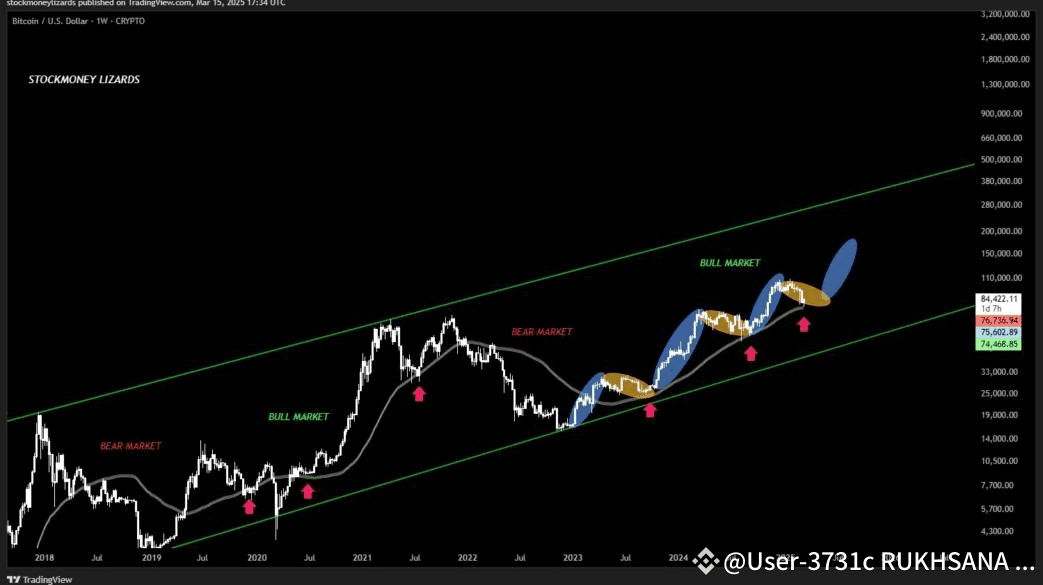 „Während viele in Panik geraten und einen Bärenmarkt proklamieren, bleibt der langfristige Trendkanal (grüne Linien) fest intakt“, fasste es zusammen und zeigte ein Diagramm, das die BTC-Preisschwankungen um eine durchschnittliche Trendlinie während der Bullenmärkte darstellt.