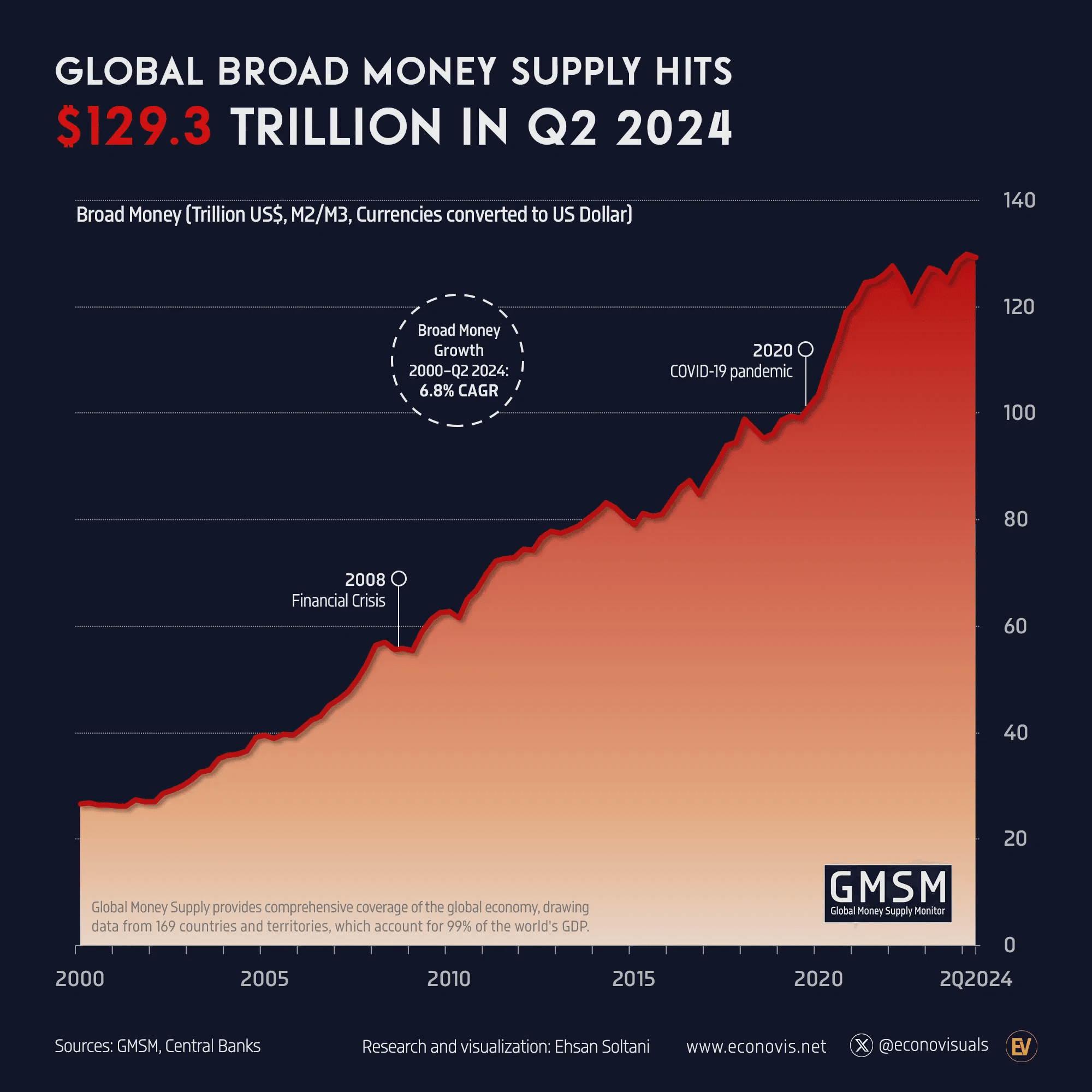 Diese Zahl würde die globale breite Geldmenge, die im zweiten Quartal 2024 auf 129,3 Billionen USD geschätzt wurde, bei weitem übersteigen und ist weit größer als die Marktkapitalisierung von Gold in Höhe von 21,86 Billionen USD, dem wertvollsten Asset der Welt.