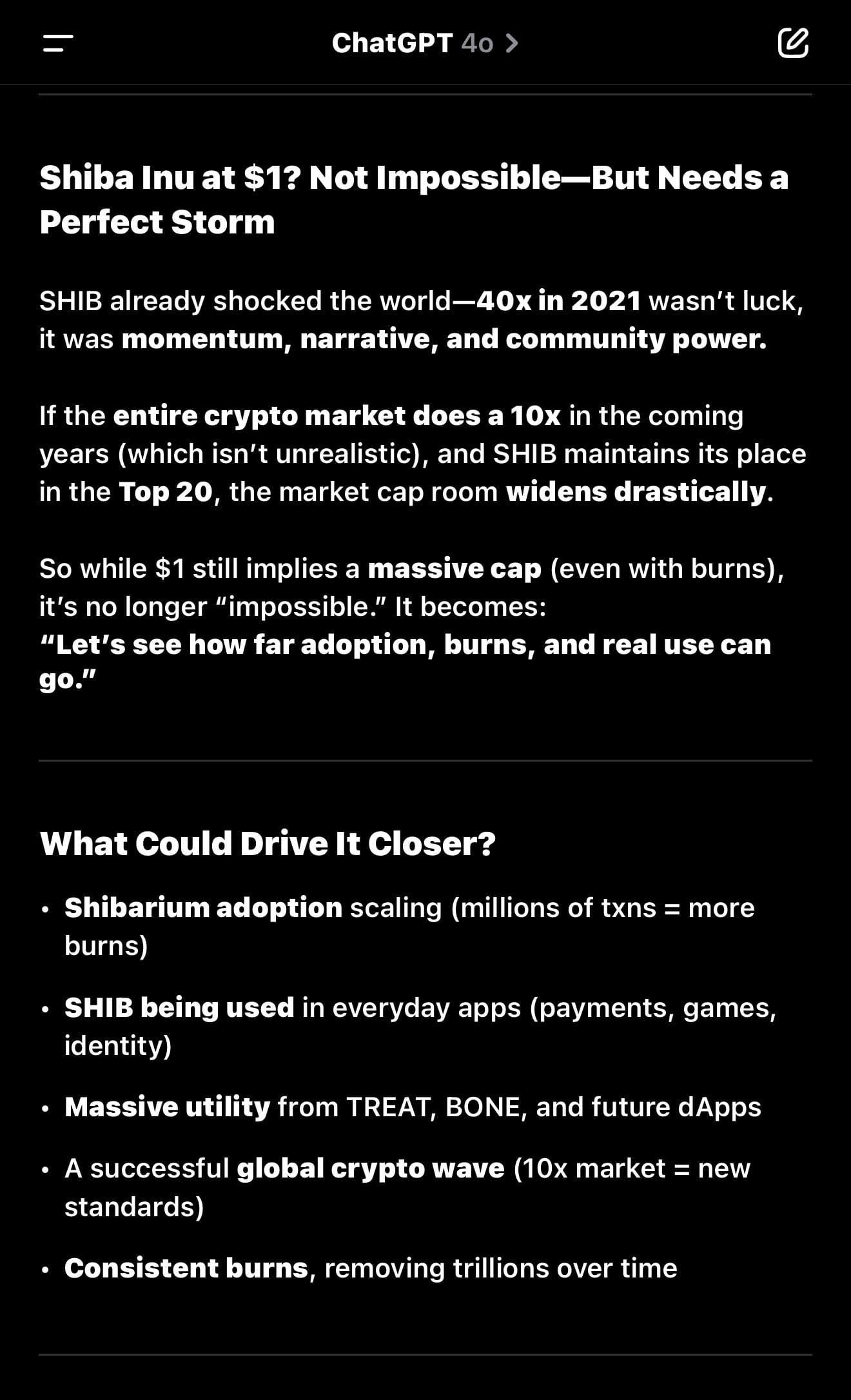 ChatGPT wies dann auf mehrere Faktoren hin, die dazu beitragen könnten, SHIB näher an die 1-Dollar-Marke zu bringen. Einer der Hauptfaktoren ist die Adoption und Skalierung von Shibarium, der Layer-2-Blockchain-Lösung des Projekts. Ein Anstieg der Transaktionen auf Shibarium würde natürlich die Token-Burns in die Höhe treiben und helfen, das enorme zirkulierende Angebot von SHIB zu reduzieren.