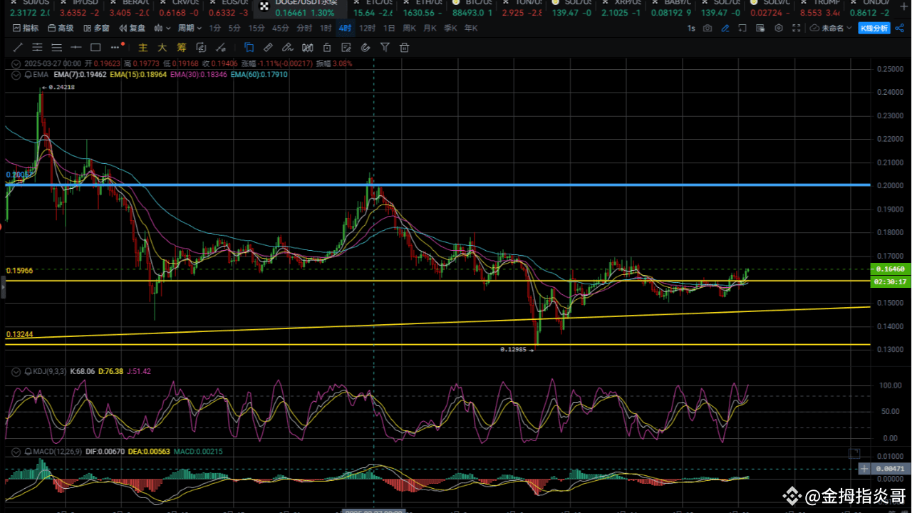 Insgesamt befindet sich DOGE derzeit in einer Erholungsphase, der allgemeine Trend bleibt jedoch schwach. Kurzfristig muss genau beobachtet werden, ob der Preis den EMA-Widerstand durchbrechen kann und wie sich die MACD- und KDJ-Indikatoren ändern. Wenn die Erholungsdynamik zunimmt und die technischen Indikatoren ein Kaufsignal geben, könnte es zu einer Aufwärtsbewegung kommen. Andernfalls könnte der Preis weiterhin in der unteren Bandbreite schwanken oder sogar erneut das Unterstützungsniveau testen.