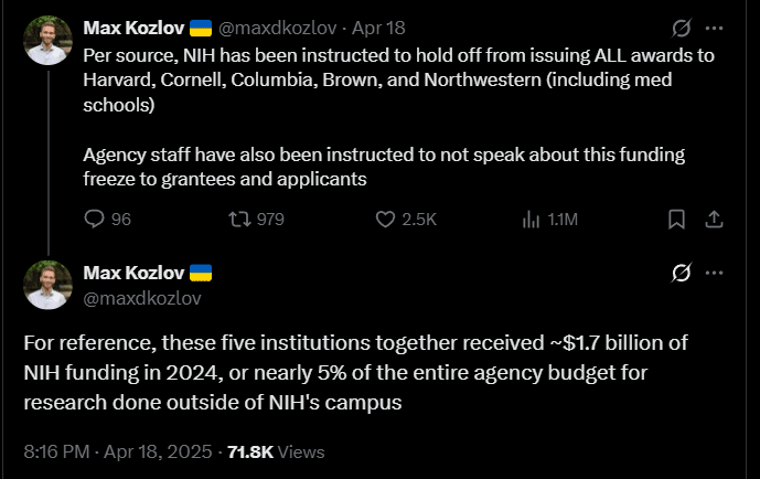 Eine geleakte E-Mail der National Institutes of Health (NIH) enthüllte interne Anweisungen, die Vergabe von Zuschüssen an Harvard, Columbia, Brown, Cornell und Northwestern zu verzögern. Diese fünf Institutionen erhielten im letzten Jahr 1,7 Milliarden Dollar an NIH-Zuschüssen.