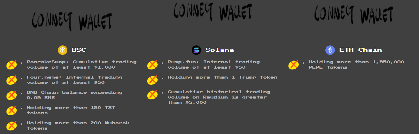 PancakeSwap Handelsvolumen: Das kumulierte Handelsvolumen auf PancakeSwap beträgt mindestens 1.000 $. Wenn Sie häufig auf der BSC-Chain handeln, sollten Sie Ihre Transaktionsaufzeichnungen auf PancakeSwap überprüfen, da Sie diese Bedingung möglicherweise erfüllt haben. Handelsvolumen der Four.meme-Plattform: Das interne Handelsvolumen auf der Four.meme-Plattform beträgt mindestens 50 $. Dies ist auch eine Bedingung, die Sie erfüllen können, um zu sehen, ob Sie genügend Handelsvolumen auf der Plattform haben. BNB-Chain-Balance: Der Wallet-Saldo auf der BNB-Chain beträgt mehr als 0,05 $BNB . Diese Bedingung ist relativ einfach zu erfüllen. Sie können Ihren Wallet-Saldo überprüfen. Wenn er nicht ausreicht, sollten Sie in Betracht ziehen, Ihr Konto mit dem entsprechenden Betrag aufzufüllen. $TST Bestände: Halten Sie mehr als 150 Token. Wenn Sie zuvor an verwandten Projekten teilgenommen haben, sollten Sie Ihre Bestände überprüfen. Mubarak Bestände: Halten Sie mehr als 200 Mubarak-Token. Überprüfen Sie ebenfalls Ihre Wallet, um sicherzustellen, dass Sie genügend Mubarak-Token haben.