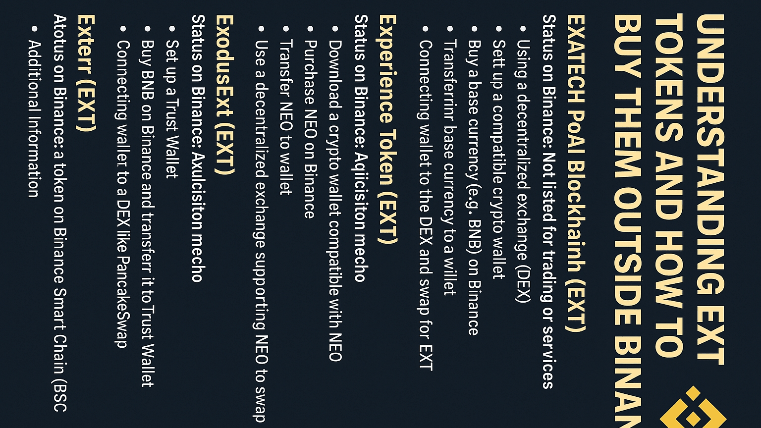 Der Begriff "EXT" ist mit mehreren Tokens im Kryptowährungsbereich verbunden, die jeweils unterschiedliche Eigenschaften und Verfügbarkeiten auf Handelsplattformen wie Binance haben. Hier ist eine Übersicht über bemerkenswerte EXT-Tokens und Hinweise, wie man sie erwerben kann: