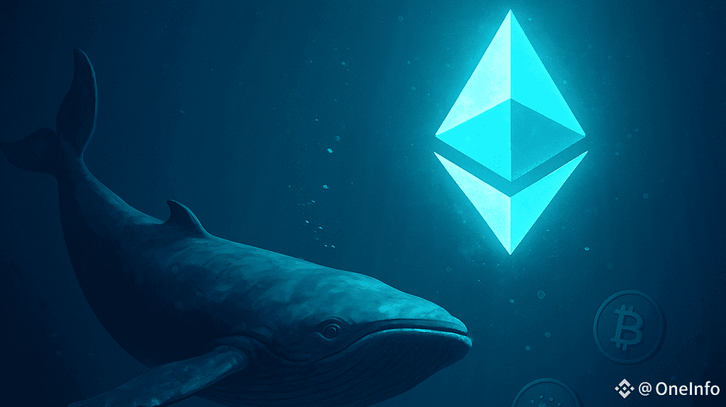 Eine hochwirksame Grafik, die einen massiven Wal zeigt, der auf ein leuchtendes Ethereum-Logo tief im Ozean zuschwimmt, während BTC und andere Altcoins wie ADA und XRP in der Nähe schwimmen. Die Szene symbolisiert Akkumulation und den Aufbau von Momentum unter Wasser (im Hintergrund) vor einem Marktausbruch.