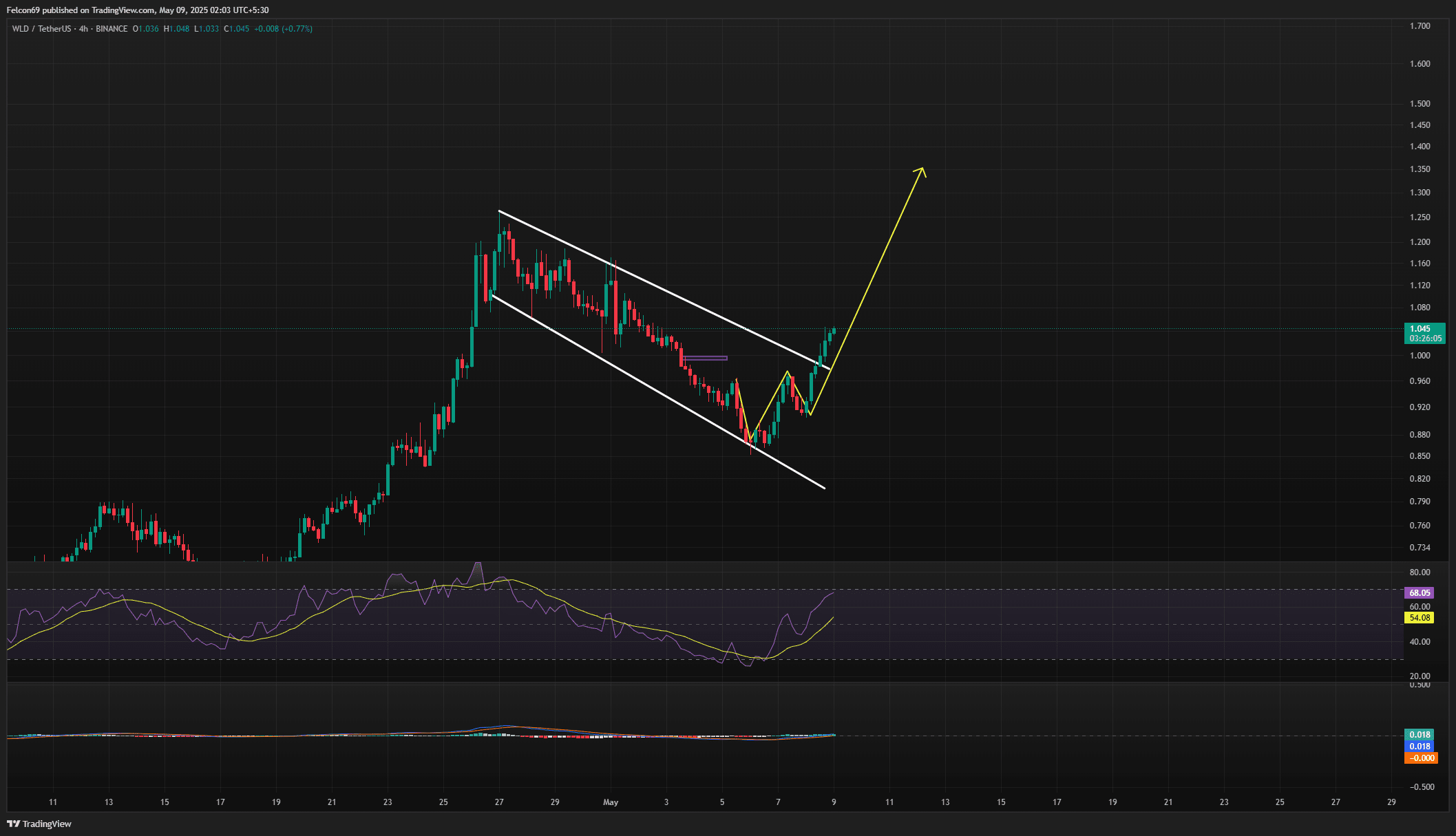 1) Dieses Diagramm zeigt WLD (Wilder World) gegen USDT auf einem 4-Stunden-Zeitrahmen und zeigt ein steigendes Keilmuster, das kürzlich nach oben ausgebrochen ist. Es deutet auf ein Long-Trading-Setup hin. Der Preis war innerhalb des steigenden Keils und ist jetzt über die obere Trendlinie ausgebrochen, was auf eine mögliche Fortsetzung nach oben hindeutet. Dieser Ausbruch deutet darauf hin, dass die bullische Dynamik an Stärke gewinnt.