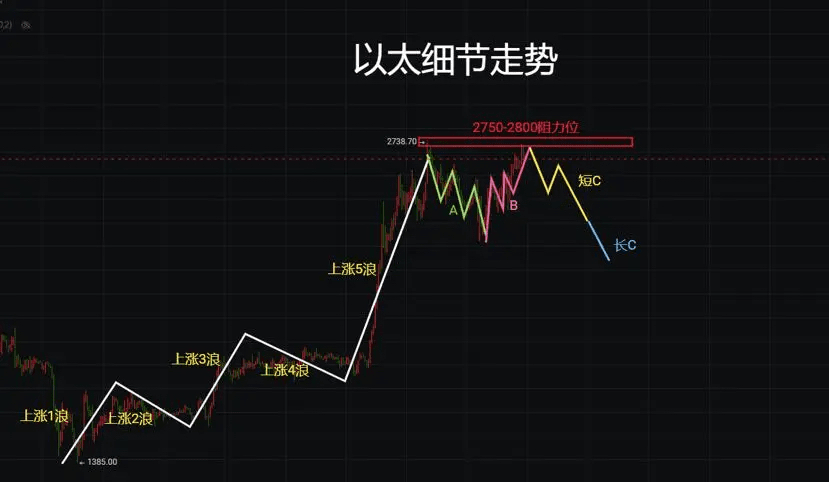 Seit 1400 hat sich eine 5-Wellen-Anstiegsmuster entwickelt. Wenn beim ersten Mal Widerstand von 2750 - 2800 nicht durchbrochen wird, wird eine ABC-Wellen-Konsolidierungsbewegung eröffnet. Aktuell befinden wir uns in der B-Welle, wenn die B-Welle beim Rückgang nicht den Widerstands-Hochpunkt erreicht, wird es danach eine C-Welle nach unten geben. Das kurzfristige Ziel der C-Welle liegt bei 2400, das langfristige Ziel der C-Welle sollte bei 2200 - 2300 im Auge behalten werden. Nach Abschluss der Konsolidierung wird Ethereum das Ziel von 3000 anvisieren.
