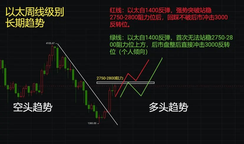 Grüne Linie: Beginnt mit einem Rückgang von 1400, beim ersten Mal kann sich der Markt nicht über dem Widerstandsbereich von 2750 - 2800 stabilisieren, danach wird der Markt nach einer Konsolidierung erneut das Umkehrniveau von 3000 anvisieren.