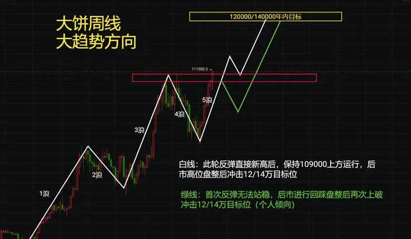 Die langfristige Trendzielerwartung von Bitcoin für das laufende Jahr von 120000/140000 bleibt unverändert. Persönlich neige ich eher zur grünen Linie, das heißt, wenn der erste wöchentliche Rückgang kein neues Hoch erreichen kann, wird der Markt nach der Konsolidierung erneut steigen.