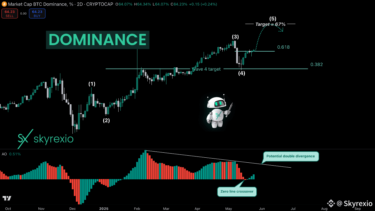 Lass uns zu den Elliott-Wellen gehen. Wie ich dir gesagt habe, ist Welle 4 auf dem 0,38 Fibonacci-Niveau abgeschlossen und mit dem Awesome Oscillator, der die Nulllinie gekreuzt hat. Jetzt ist es Zeit für Welle 5. Das Ziel bleibt dasselbe, nämlich 67%. Nur wenn wir diesen Preis und die doppelte Divergenz sehen, haben wir eine Chance, dass die Liquidität von Bitcoin zu Altcoins transferiert wird. Die nächsten 2 Wochen werden eine Katastrophe für alle Altcoin-Halter sein.