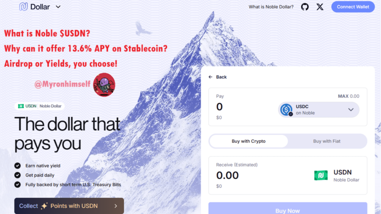 Noble kommt aus dem Cosmos- und IBC-Ökosystem und wird im März 2025 einen ertragsbringenden Stablecoin $USDN auf der Basis von kurzfristigen US-Staatsanleihen herausbringen, der zeitlich begrenzte 13,6% APY Stablecoin-Erträge oder die Möglichkeit bietet, die Zinsen aufzugeben und nur Airdrop-Punkte zu verdienen.