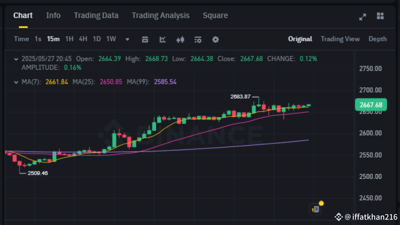 Kerzenmuster: Der Chart zeigt eine Reihe von grünen Kerzen in letzter Zeit, was auf Kaufdruck und einen kurzfristigen Aufwärtstrend hinweist. Der Preis erreichte ein Hoch von 2.683,87 $, bevor er leicht auf 2.667,68 $ zurückging.