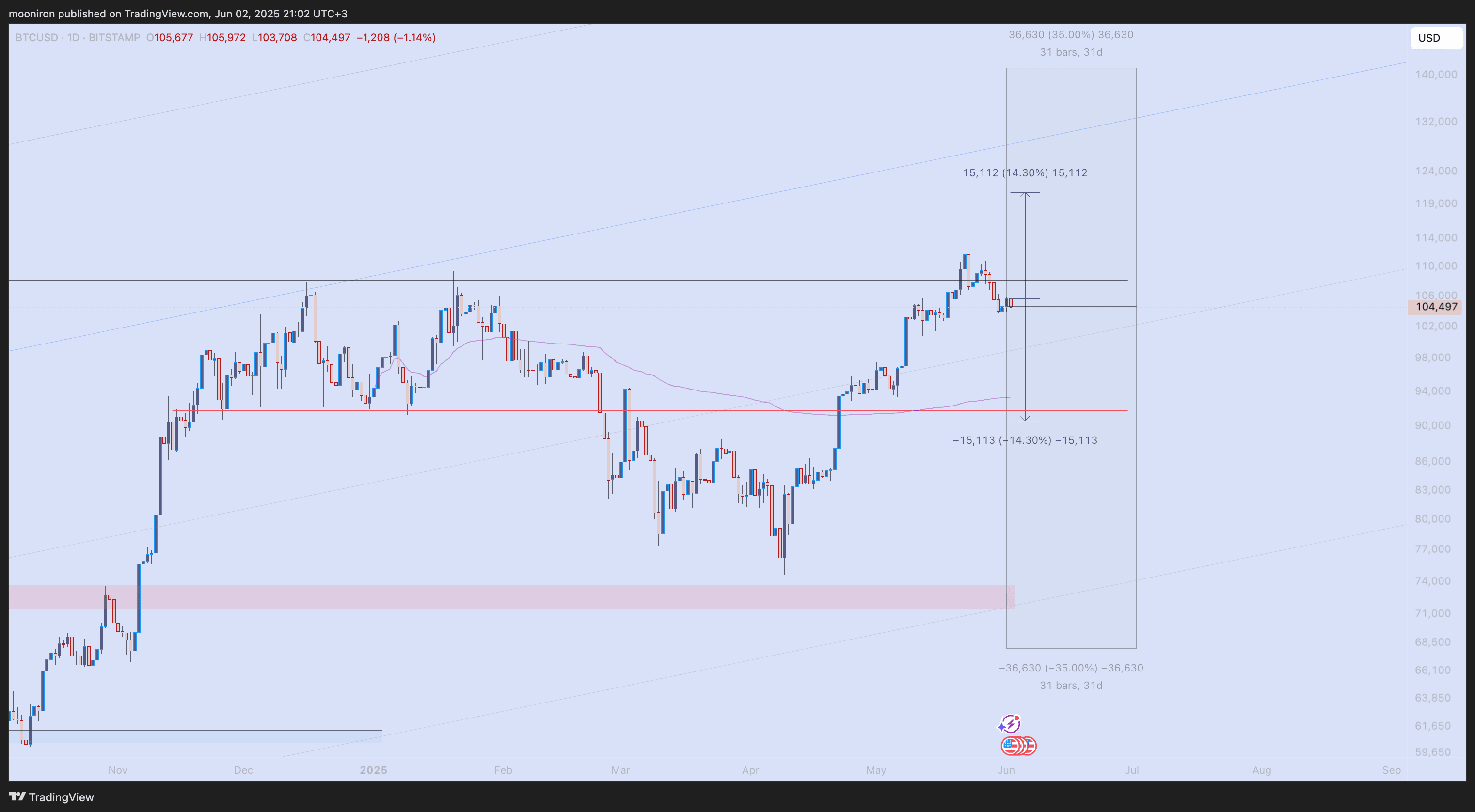 Die Tatsache, dass der Preis sich nicht entscheidend nach oben oder unten bewegt, zusammen mit Markt-, Wirtschafts- und geopolitischen Unsicherheiten, erhöht die Erwartung scharfer bidirektionaler Bewegungen. Ich glaube jedoch nicht, dass eine Top-Struktur bereits gebildet wurde, und ich denke, dass jede potenzielle Abwärtsbewegung eine Korrektur bleiben wird. Ich erwarte, dass $98k und $93k als wichtige Unterstützungslevel fungieren werden. Ich werde Long-Positionen eingehen, wenn der Preis diese Regionen erreicht. Offen gesagt würde eine direkte Aufwärtsbewegung einige Fragen bei mir aufwerfen, aber ich würde dennoch eine kleine Position hinzufügen.