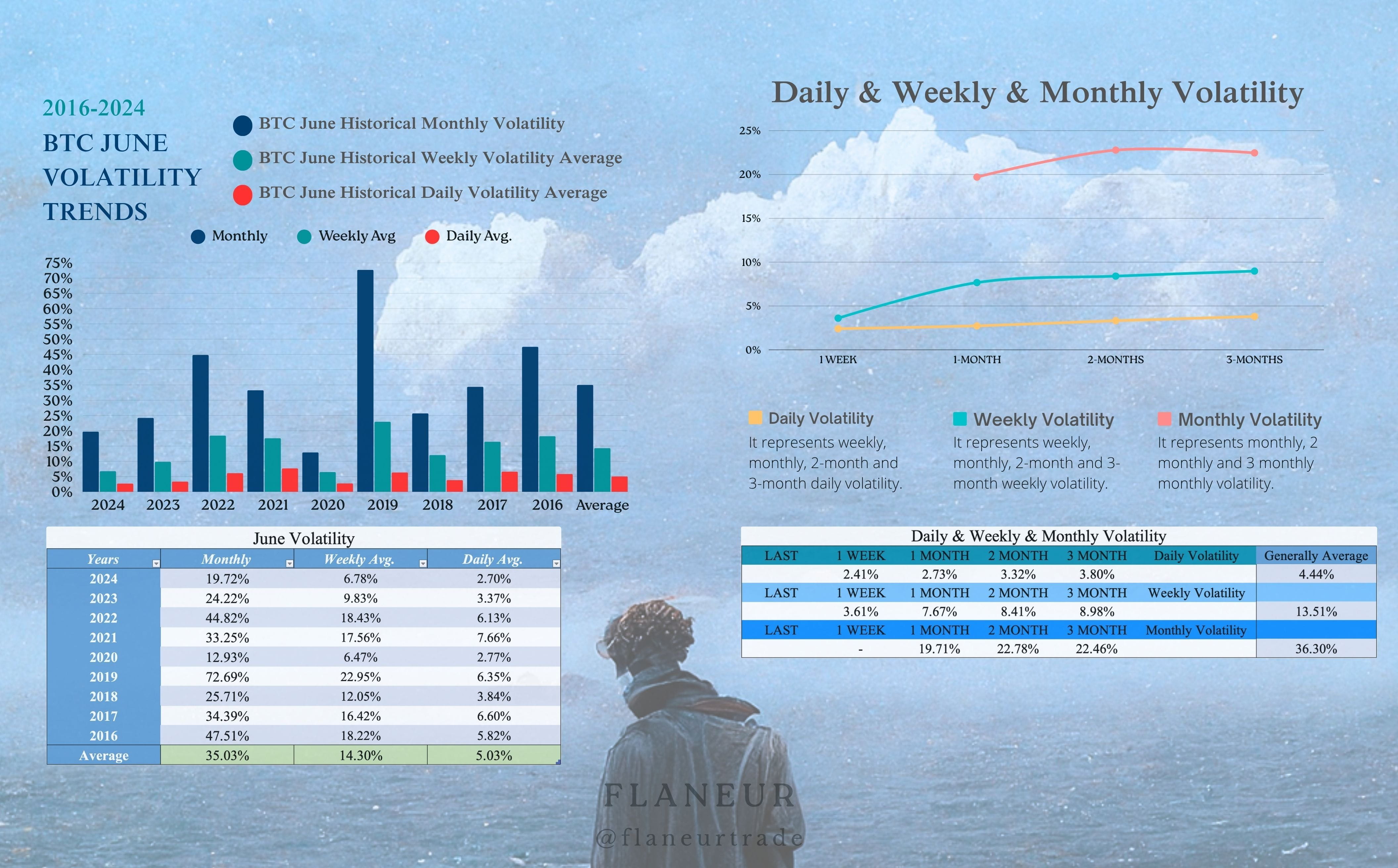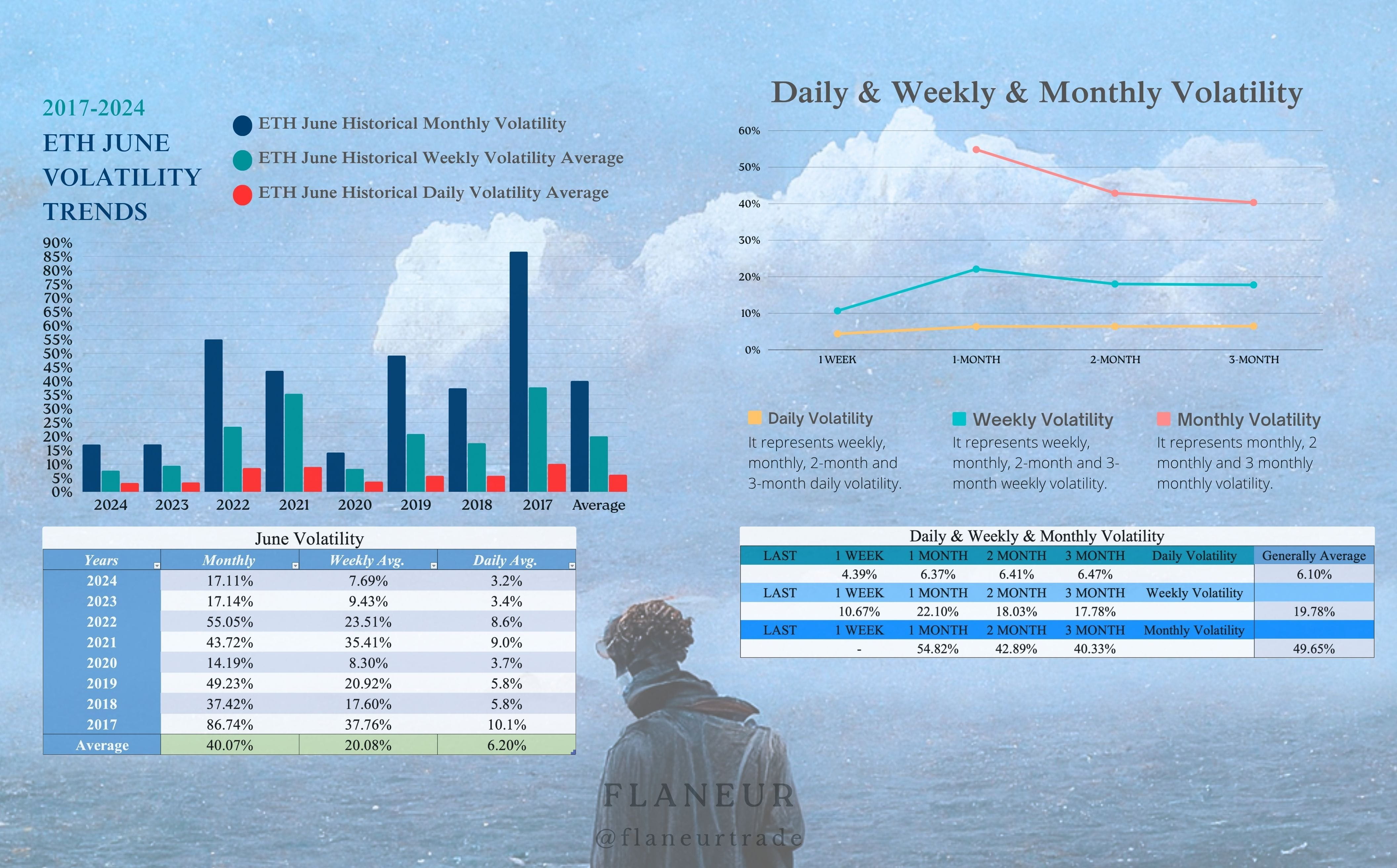 Die monatliche durchschnittliche implizite Volatilität für Juni beträgt 40%, was dem Bereich von $1500-$3550 entspricht. Die wöchentliche durchschnittliche implizite Volatilität beträgt 20%, was dem Bereich von $2030-$3050 entspricht. Wir haben in den letzten Monaten einen signifikanten Anstieg der Volatilität von ETH gesehen, und sie steigt weiter.