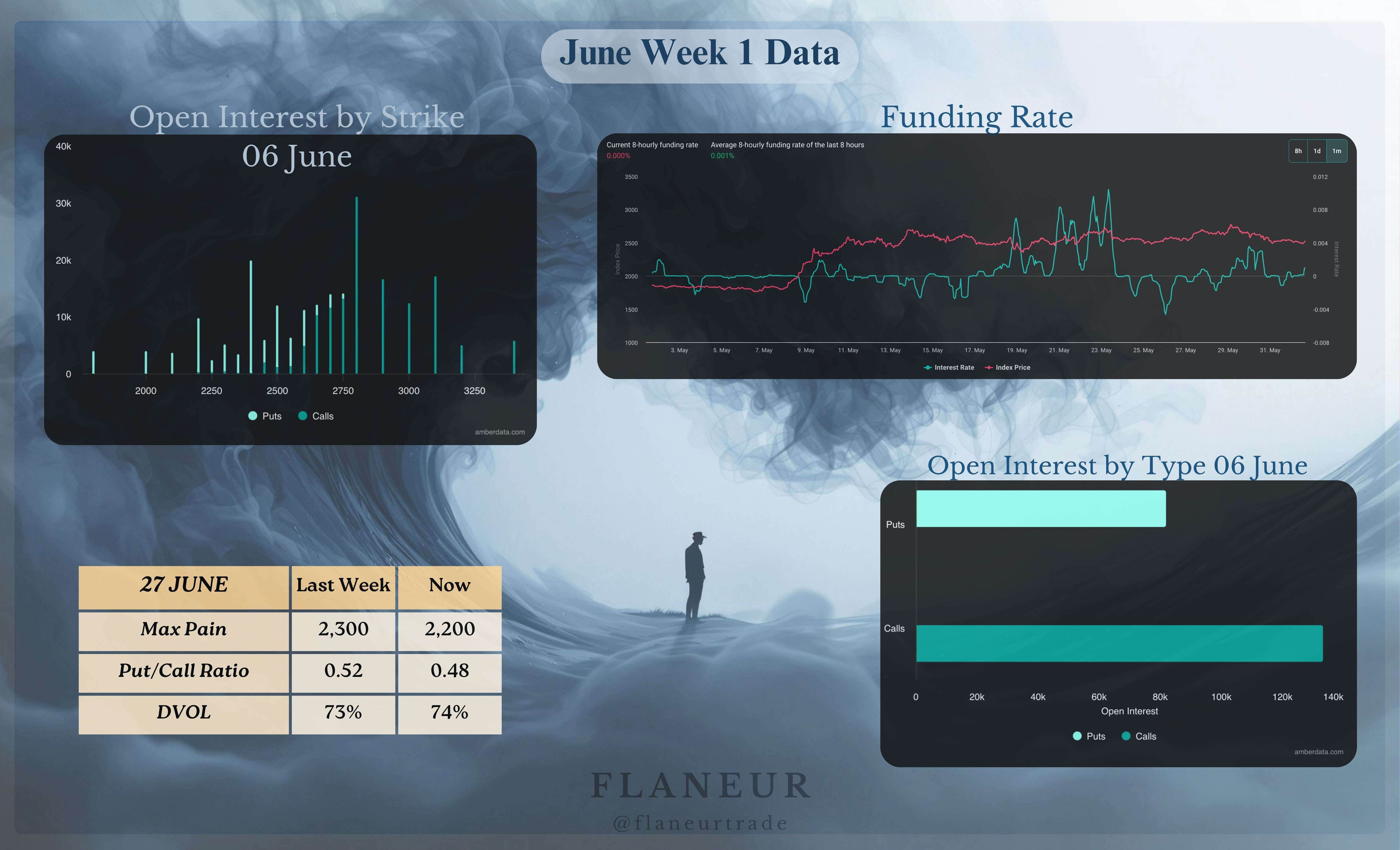 Für Juni-Verträge hat der Markt eine sehr bullische Erwartung mit einem Put/Call-Verhältnis von 0,48, und es gibt aktives, hochvolumiges Kaufen von Ende-Juni-Verträgen. Der Max-Pain-Preis für Ende Juni liegt bei $2200, und für den 6. Juni bei $2600. Das P/C-Verhältnis für den Vertrag vom 6. Juni beträgt 0,62, was erneut ein bullisches Bild zeigt.