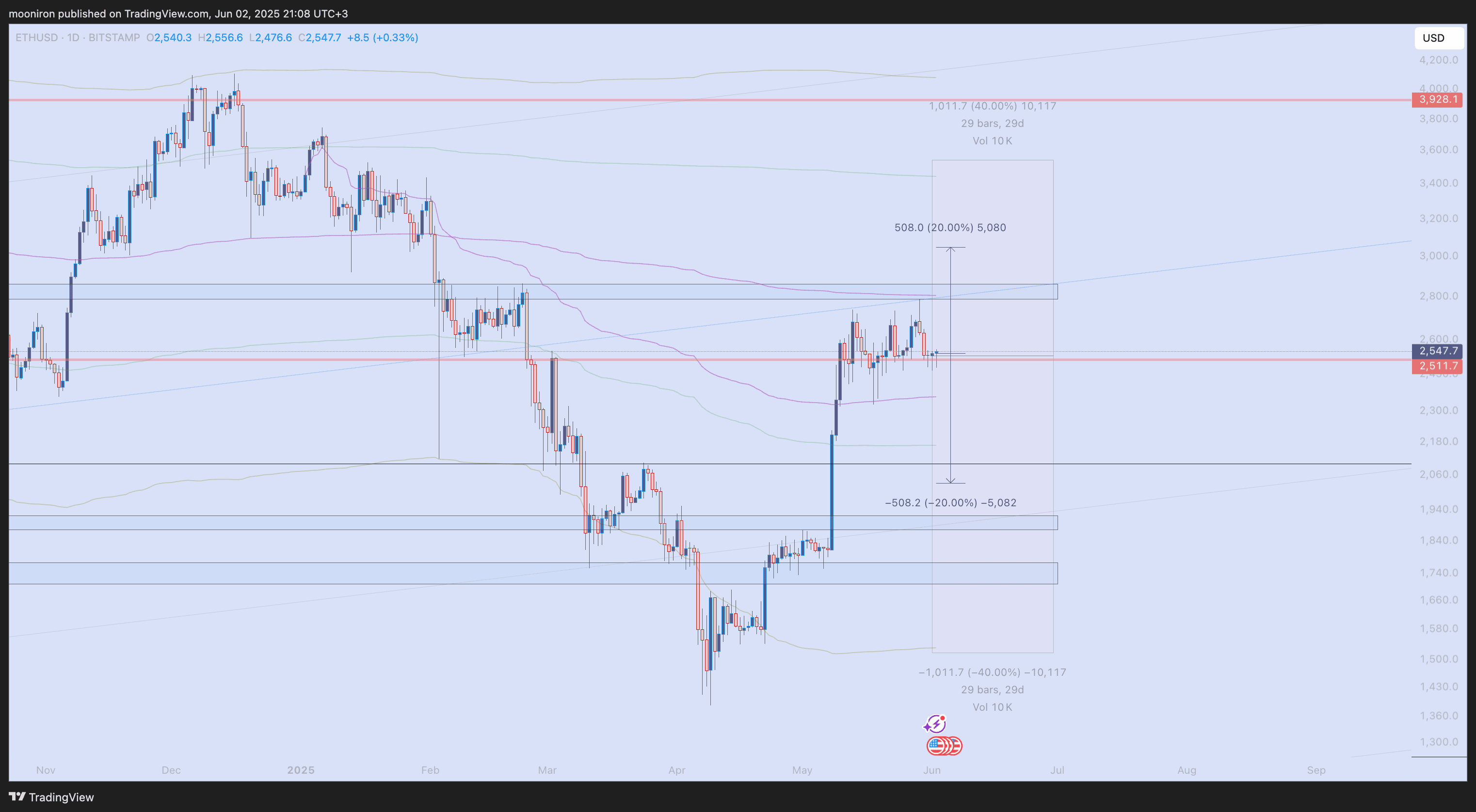 ETH, das den Mai mit 58% Volatilität abgeschlossen hat, bewegt sich seit drei Wochen seitwärts nach seinem Anstieg in der ersten Woche. Diese Akkumulation unter dem Widerstand macht die, die die Hoffnung verloren haben, nervös, ähnlich wie die Situation mit BTC. Das wirft die Frage auf: Wenn der Preis nach unten korrigiert, werden wir Panikverkäufe sehen, oder wird er scharf ansteigen, ohne eine Korrektur, und diejenigen, die den anfänglichen Anstieg verpasst haben, zurücklassen, während sie darauf warten, zu kaufen?