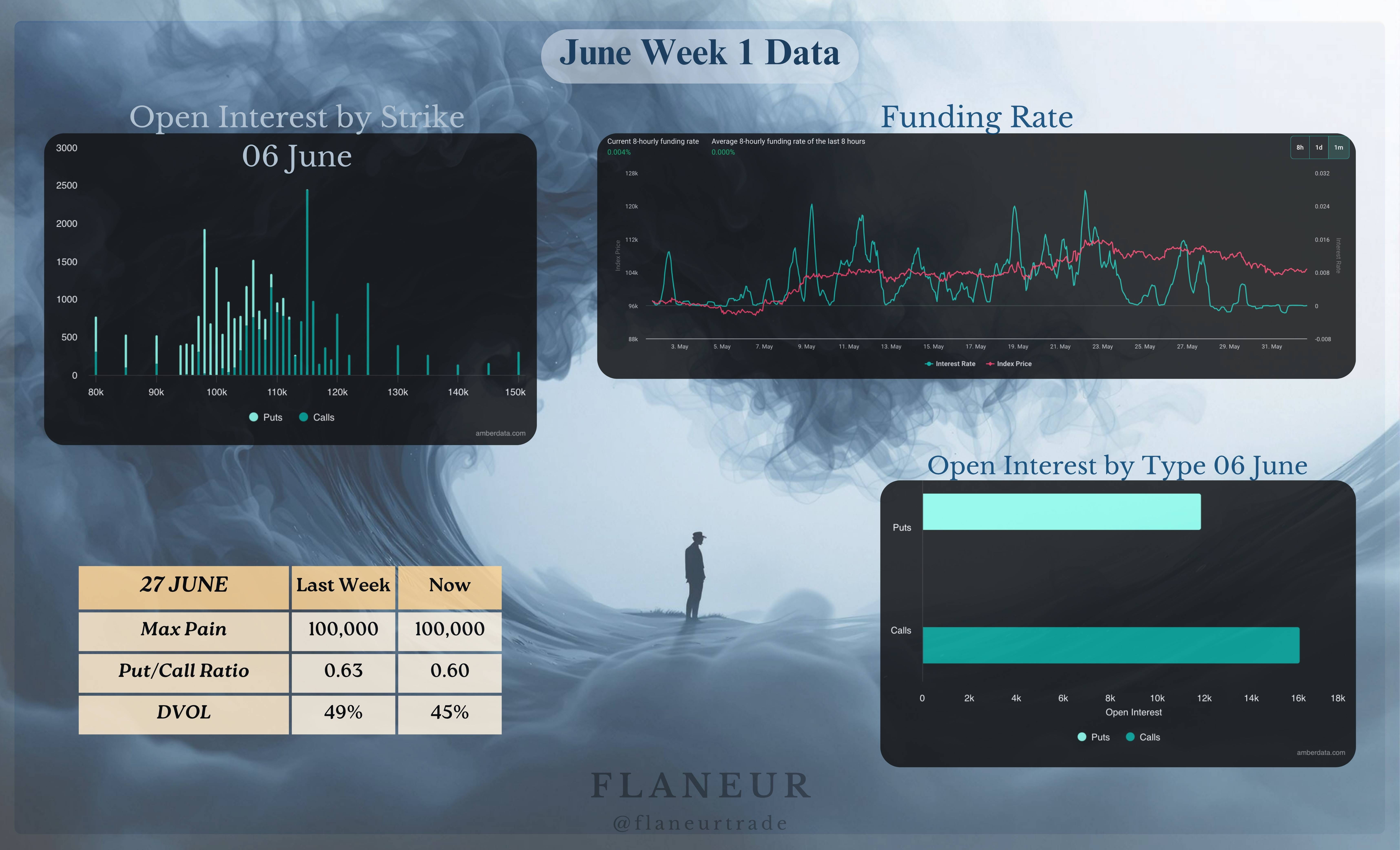 Für die Verträge Ende Juni beträgt der Max-Pain-Preis $100k, und das Put/Call-Verhältnis ist 0,60, was ein sehr bullisches Bild zeichnet. Mit dem jüngsten Rückgang der Volatilität ist der DVOL heute auf 42% gesunken. Der Funding-Rate liegt seit einiger Zeit bei 0; wenn er während einer möglichen Korrektur negativ wird, wäre das eines der größten bullischen Signale für mich. Für den wöchentlichen Vertrag vom 6. Juni beträgt der Max-Pain-Preis $105k, und das Put/Call-Verhältnis ist 0,75, was ein etwas bullisches Sentiment anzeigt. Es ist auch erwähnenswert, dass es ein signifikantes Volumen in den Juni-Verträgen gibt.