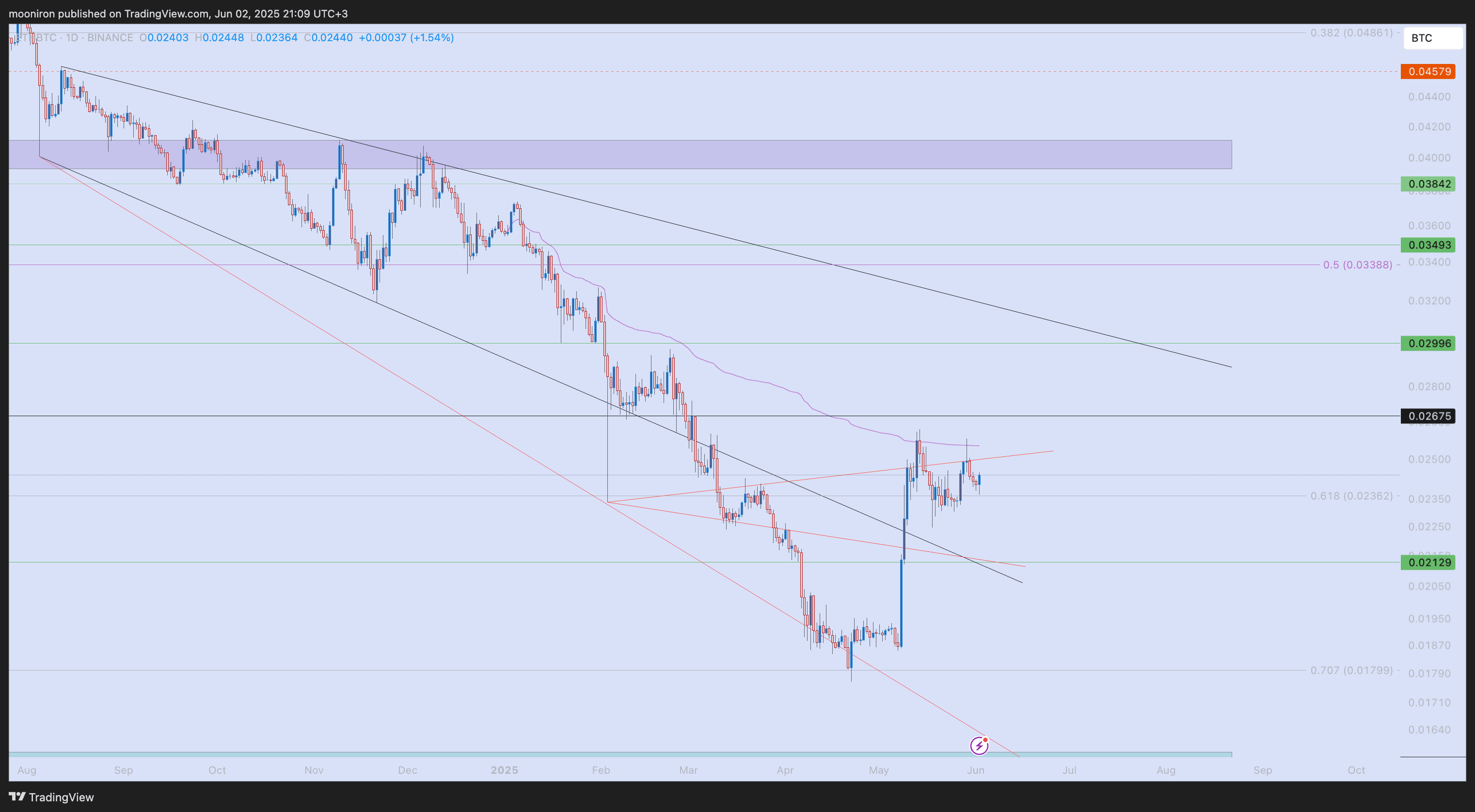 Im April, trotz eines sehr starken Rückgangs, hat sich ETH schnell erholt und seine Kerzenstruktur vor einem bärischen Ausblick gerettet. Im Mai sendete es eine klare "Ich bin noch nicht tot"-Nachricht mit einer starken Rallye. Während viele, die pessimistisch gegenüber Altcoins waren, die Hoffnung zurückgewonnen haben, warten diejenigen, die die Kaufgelegenheit verpasst haben, nun auf eine Korrektur. Ich neige dazu, bei Rücksetzern in die Region von $2350 und darunter Käufer zu sein. Besonders die Zone von $2100-$2200 ist ein sehr guter Bereich für Positionierungen. Ich plane, mich für Ende Juni und Juli mit schrittweisen Käufen bei Rücksetzern in diesen Bereich zu positionieren. Die wichtigen Punkte auf meinen Diagrammen sind seit Monaten festgelegt. Einer davon ist die rote Linie bei 2500 und die blaue Box im Bereich 2800-2900. Wie ich bereits erwähnt habe, ist es nicht richtig, zu viel zu träumen, bevor diese Bereiche vollständig durchbrochen sind. Wir haben immer noch keinen guten wöchentlichen Schluss über 2500 gesehen. Aus diesem Grund werde ich beginnen, in der Korrektur, die mit dem neuen Monat kommt, nach oben zu positionieren. Die Bereiche 2300-2100 werden meine Kaufpunkte für Aufwärtspositionen sein. Das ist mein allgemeiner Plan.
