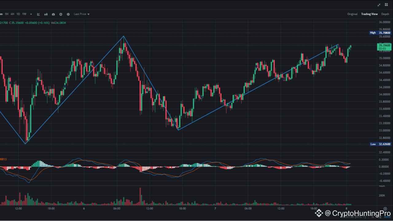 Testen der vorherigen Hochregion nahe $35.70 – möglicher Ausbruch-Setup
