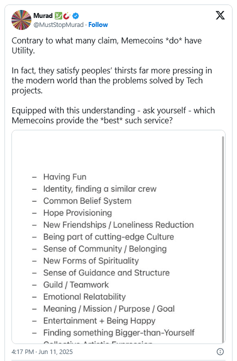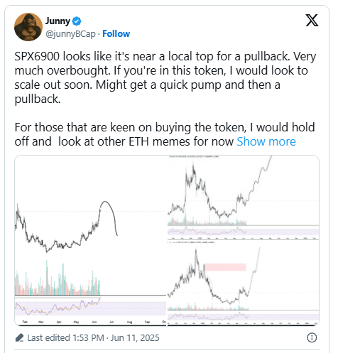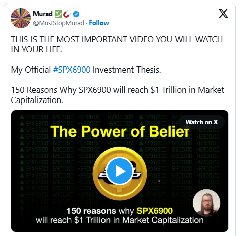 Murad Mahmudov, ein bekannter Krypto-Investor, ist ein lautstarker Unterstützer von SPX6900. Er hat es sogar in seine These zum "Memecoin Supercycle" integriert, die besagt, dass Tokens wie dieser, selbst ohne traditionelle Nützlichkeit, massive Gewinne dank viraler Anziehungskraft und starker Gemeinschaftsunterstützung erzielen können.