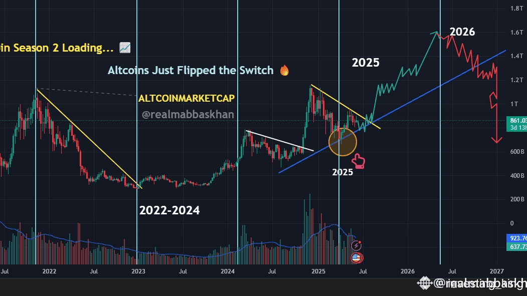 Altcoins waren seit Ewigkeiten unter diesem gelben Abwärtstrend gefangen, aber rate mal? Wir sind gerade sauber und stark ausgebrochen 🟢 Und schau genau hin, dieser Bounce von der 200MA 👀? Das ist Lehrbuch-Raketenbenzin. Der Weg vor uns könnte explosiv sein, aber nur für diejenigen, die das Chop überstehen und tatsächlich warten.