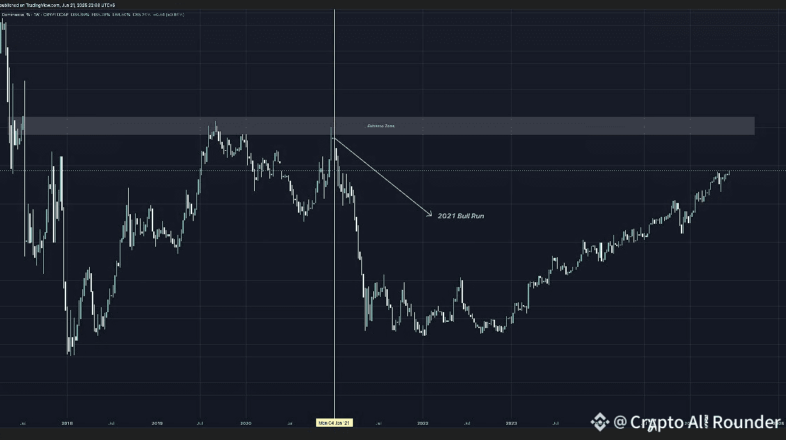 In der letzten Bullenlauf haben wir gesehen, dass die Bitcoin-Dominanz über 70 % gestiegen ist. Danach begann die Dominanz zu sinken, und in dieser Zeit begannen alle Altcoins nacheinander zu pumpen. Das war ein großer Indikator - der Beginn der Altseason.