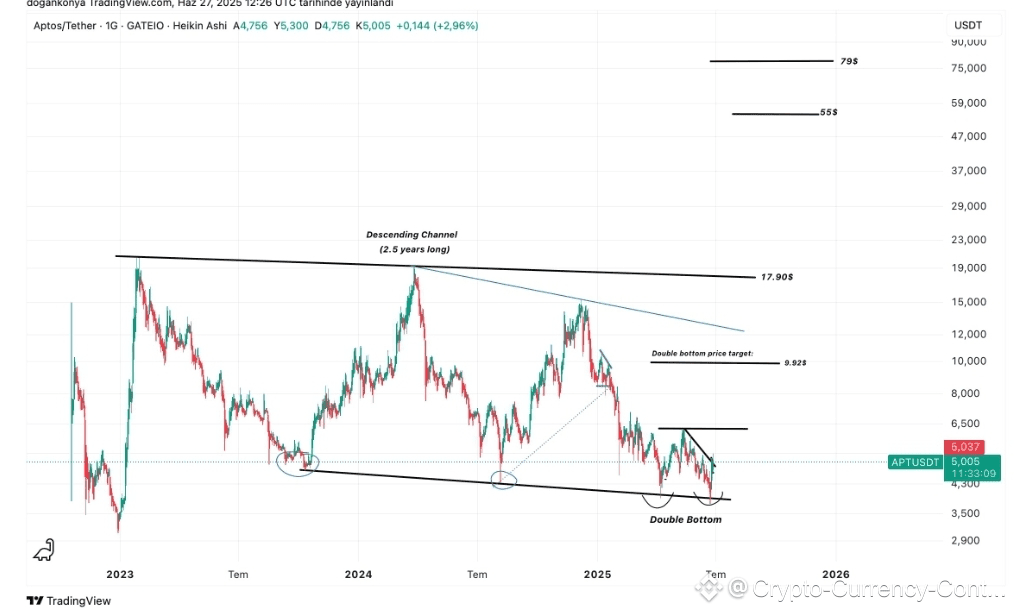 في منشور حديث على X بتاريخ 27 يونيو، قدّم PlanD تحليلاً فنياً ثاقباً لسوق APT، مُشيراً إلى ارتفاع كبير في الأسعار. أولاً، أوضح المحلل الشهير أن APT أظهر حركة سعرية ثابتة داخل قناة هابطة على مدار العامين والنصف الماضيين.
