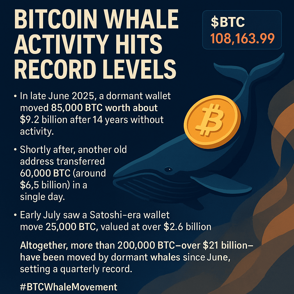 Insgesamt wurden über 200.000 BTC – im Wert von mehr als 21 Milliarden Dollar – seit Juni von lange inaktiven Wal-Wallets verschoben, was einen neuen vierteljährlichen Rekord für die Bewegung inaktiver Wale markiert.