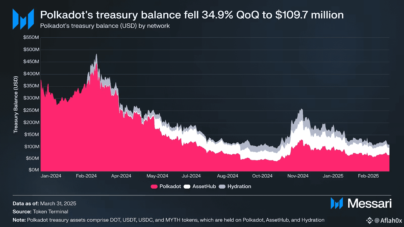 Am 31. März 2025 hielt das Schatzamt von Polkadot nur 109,7 Millionen Dollar, ein starker Rückgang von zuvor 400 Millionen Dollar.