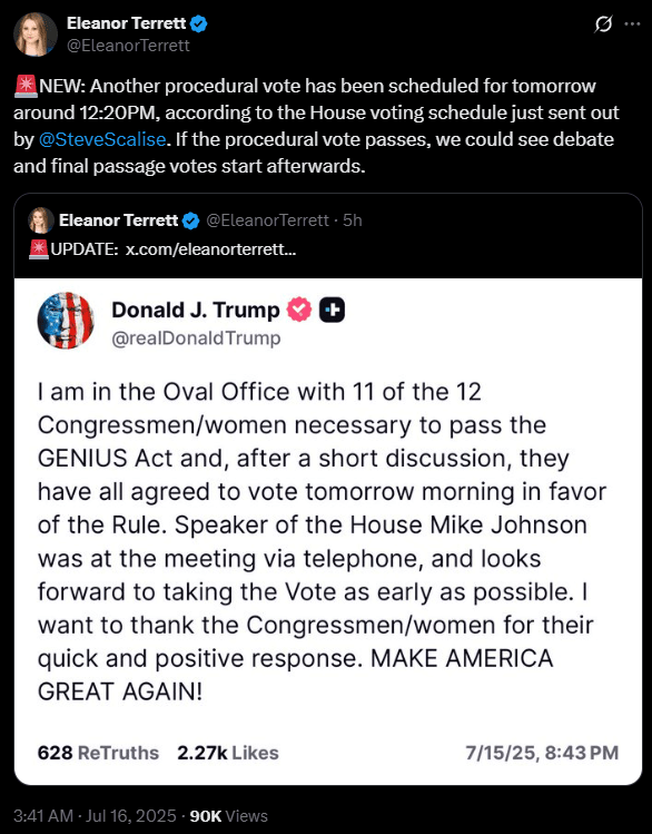 „Ich bin im Oval Office mit 11 Abgeordneten, die notwendig sind, um das GENIUS-Gesetz zu verabschieden. Nach einer kurzen Diskussion stimmten wir alle zu, dass sie morgen früh dafür stimmen werden“, kündigte Trump an.