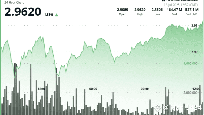 $XRP stieg um 1,79% von $2,89 auf $2,95 zwischen dem 15. Juli 13:00 Uhr und dem 16. Juli 12:00 Uhr, nachdem es zu Beginn der Sitzung auf $2,84 gefallen war.