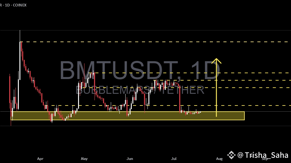 Der Tageschart von BMT/USDT zeigt eine überzeugende Struktur für Händler, die darauf abzielen, von frühen Umkehrungen und Einstiegsmöglichkeiten zu profitieren. Der Preis konsolidiert derzeit innerhalb einer starken historischen Nachfragezone, die zwischen $0,069 – $0,087 USDT schwankt – ein Niveau, das zuvor mehrere bedeutende Rallyes ausgelöst hat (März, Mai, Juli 2025).