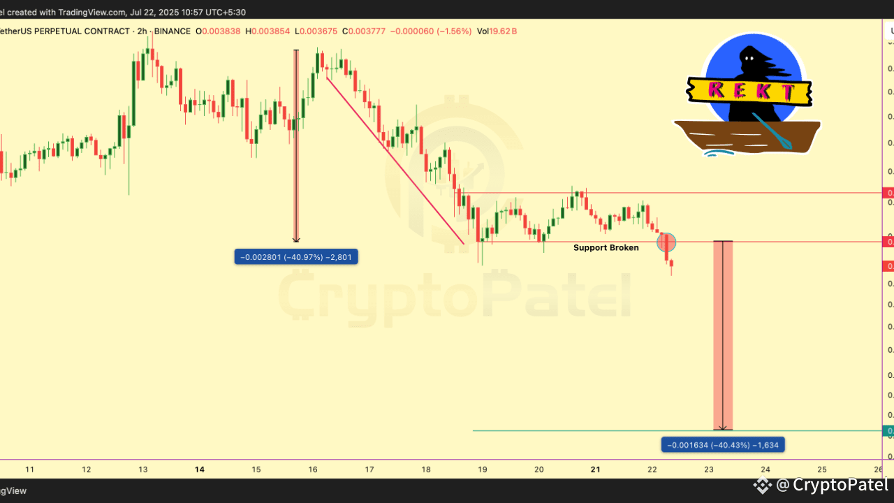 Das $PUMP -Diagramm zeigt einen klaren Strukturbruch, nachdem der Preis die wichtige Unterstützung bei 0,004035 verloren hat.