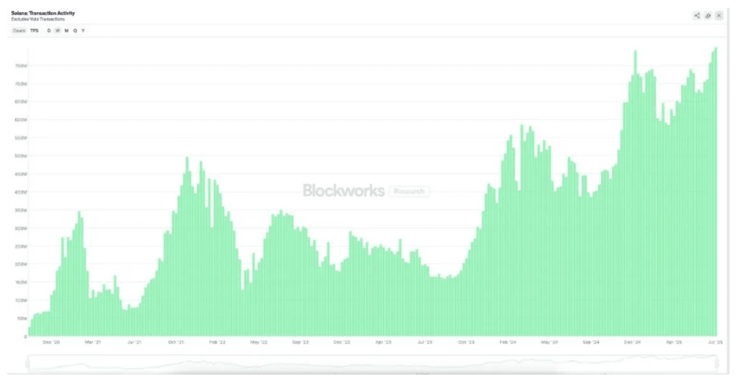 Das Blockworks-Diagramm zeigt einen klaren, stetigen Anstieg der Aktivität, was bestätigt, dass die Nutzung nicht nur spekulativ ist, sondern auf Protokollebene beschleunigt. Allein im vierten Quartal 2024 erreichte der Umsatz 800 Millionen USD, was Solana in direkte Konkurrenz zu Ethereum und sogar traditionellen Finanzsystemen bringt.