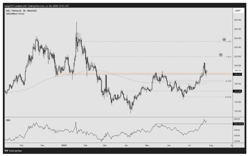 Der Solana-Preis beginnt die Woche mit einem sauberen Ausbruch über seine vorherige Konsolidierungszone, unterstützt durch steigendes Volumen und starke OBV (On-Balance Volume) Bestätigung. Die von Tang geteilte Grafik zeigt einen erfolgreichen Retest der Region von 180 bis 185 USD, die zuvor als Widerstand fungierte und jetzt anscheinend in Unterstützung umschlägt. Technisch gesehen räumt dieser Ausbruch auch das 0.236 Fib-Niveau des vorherigen makro Abwärtstrends frei, was die Bühne für eine potenzielle Trendfortsetzung bereitet.