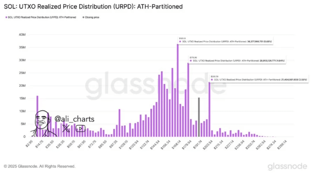 Zusätzlich zu dem bullishen Aufbau zeigt Alis neueste URPD (UTXO Realized Price Distribution) Grafik ein überzeugendes Bild für Solana, sobald es die 200 USD-Marke überschreitet. Die Daten heben hervor, dass ein Großteil der Handelsaktivität von SOL weiterhin unterhalb dieses Niveaus konzentriert ist, was bedeutet, dass die meisten Inhaber bereits im Gewinn sind und es nur ein minimales Angebot gibt, das darüber verkauft werden möchte. Strukturell schafft dies, was oft als 'dünne Zone' bezeichnet wird, einen Bereich, in dem der Preis aufgrund des Fehlens von schwerem Volumenwiderstand schnell steigen kann.