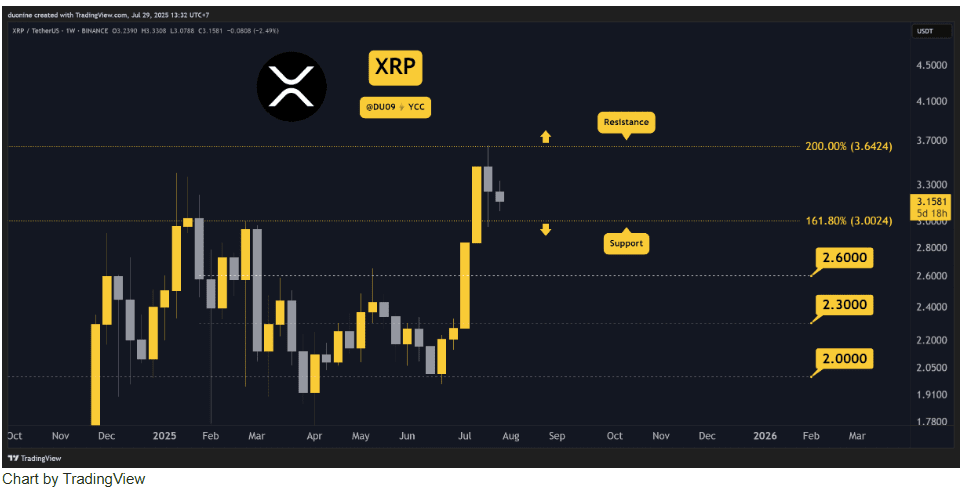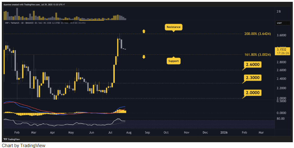 Nach einem starken Anstieg, der XRP auf ein neues Allzeithoch von über $3.6 brachte, kehrten Verkäufer zurück, um diese Kryptowährung in einen Rückzug zu bringen. Der Preis hat sich jetzt korrigiert und ist am $3 Unterstützungsniveau angekommen. Bisher haben die Käufer es geschafft, auf diesem Niveau zu halten und den Abwärtstrend zu stoppen. Ihre Widerstandsfähigkeit könnte jedoch bald erneut auf die Probe gestellt werden.