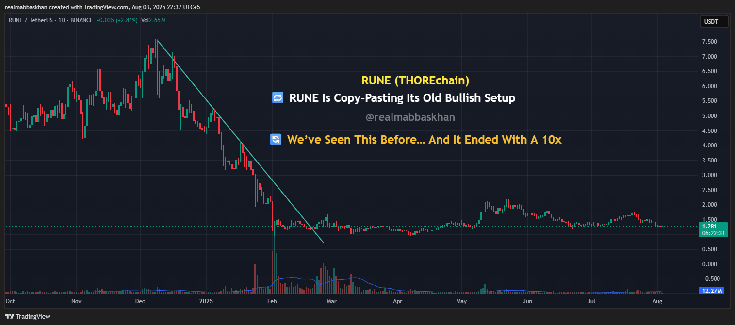 Schau dir nur RUNE an — seit Januar 2025 wurde es vernichtet 🔻, dann monatelanges Seitwärts-Geschiebe. Aber ich habe diese Geschichte schon einmal gesehen. Es ist wie das genau gleiche Muster, das wir im Oktober 2023 gesehen haben... und wieder Ende 2020.