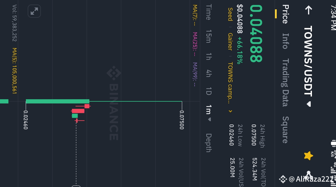 Der neu gelistete TOWNS/USDT hat heute einen kraftvollen Einstieg auf Binance gemacht. Innerhalb von Minuten nach dem Start schoss der Preis von 0.02460 auf ein Hoch von 0.07500 und zeigte enormes frühes Interesse. Aktuell wird er bei etwa 0.04088 gehandelt, was eine beeindruckende **+66—