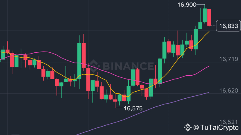 Im 15-Minuten-Chart, nachdem es auf 16.9 gestiegen ist, hat LINK eine leichte Korrektur erfahren. Dennoch zeigen die letzten roten Kerzen lange untere Schatten, was darauf hindeutet, dass die Kaufkraft um die Zone 16.7 â 16.8 weiterhin stark ist. RSI(6) liegt bei 60, immer noch im sicheren Bereich.
