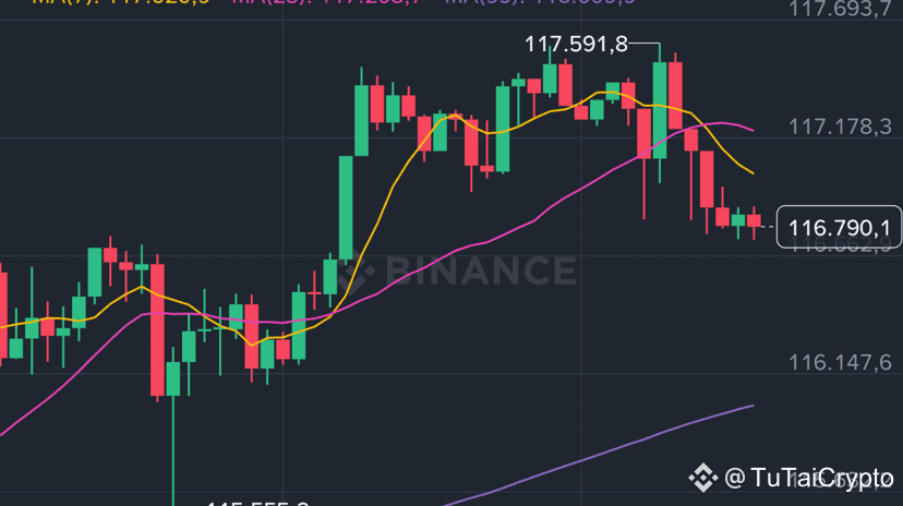 Beobachte die Reise der $BTC in der letzten Zeit, nach einem starken Durchbruch von der Zone 111.850 geradewegs auf den Gipfel 117.591 wie ein brennender Pfeil, der Markt ist nun um 116.800 etwas stiller. Dieser Anpassungsrhythmus ist nicht anders als ein tiefer Atemzug, ein strategischer Rückschritt, um Kraft zu sammeln, bevor ein neuer Beschleunigungsstoß ausgeführt wird. Lass uns jeden Zeitrahmen genau betrachten, um zu sehen, ob die "große Welle" heimlich entsteht.
