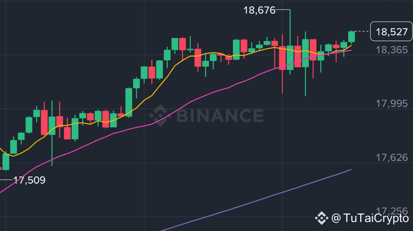 Im 1h-Chart, nach dem Erreichen des Hochs von 18.676, hat sich der Preis nur leicht korrigiert und bleibt nahe MA7, über MA25 → sehr positiv.