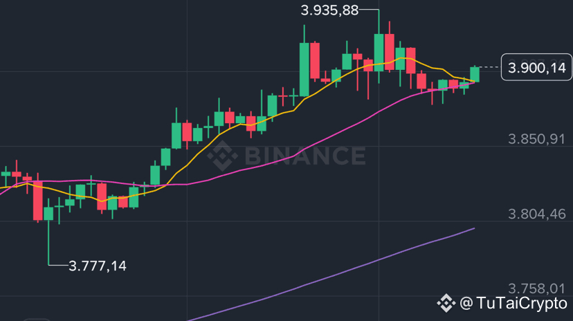 ETH befindet sich in einer gesunden Korrektur nach dem starken Anstieg. Der 4h-Zeitrahmen bleibt klar im Aufwärtstrend, kleinere Zeitrahmen (1h, 15m) zeigen Anzeichen einer Erholung. Der Bereich 3.810 – 3.830 wird als "Kauftrichter" fungieren, wenn das Szenario des Anstiegs anhält.