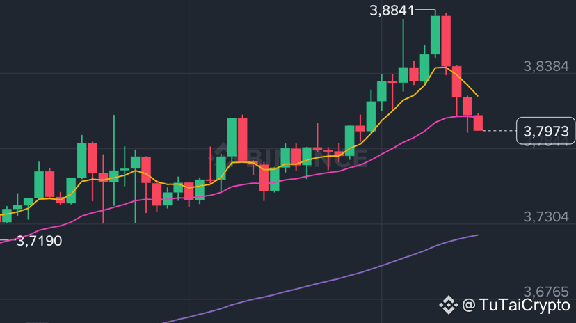 Im 1-Stunden-Chart, nach einem starken Anstieg von 3.3681 auf 3.8841, beginnt SUI leicht, Gewinne mitzunehmen. Der Preis liegt derzeit nahe bei EMA7 (3.8011) und immer noch über EMA25 (3.7289) → die Aufwärtsstruktur bleibt bestehen.