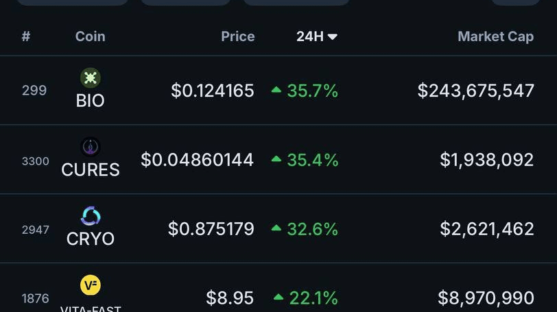 In nur 24 Stunden ist $BIO um +35,7% gestiegen und hat den ersten Platz im Bereich der dezentralen Wissenschaft (DeSci) mit einer Marktkapitalisierung von 243 Mio. $ eingenommen.