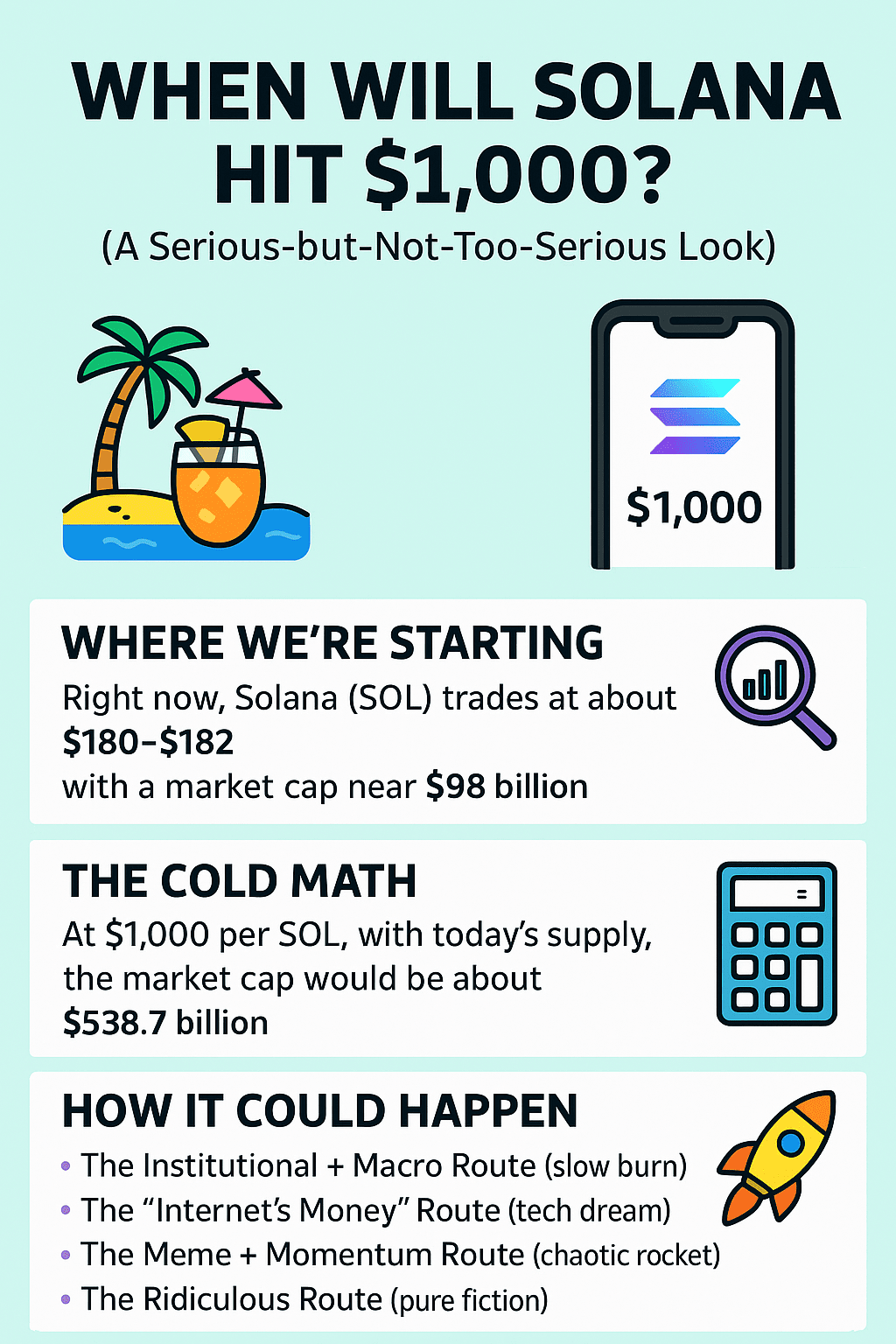 Stellen Sie sich Folgendes vor: Sie sitzen an einem sonnigen Strand, trinken ein Getränk mit einem kleinen Schirmchen darin. Plötzlich piept Ihr Handy: $SOL erreicht $1.000. Tanzen Sie? Fainten Sie? Oder bestellen Sie einen Lkw voller Ananas, nur weil Sie es können? Lassen Sie uns diese Fantasie mit etwas Mathematik, einer Prise Logik und einem Hauch von Humor erkunden.