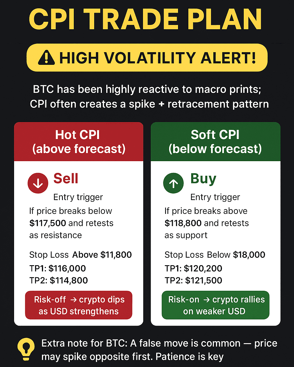 $BTC hat in letzter Zeit zu makro Beats getanzt – CPI-Tage bringen oft einen Anstieg + Rückzug. Lassen Sie uns für beide Ergebnisse planen: