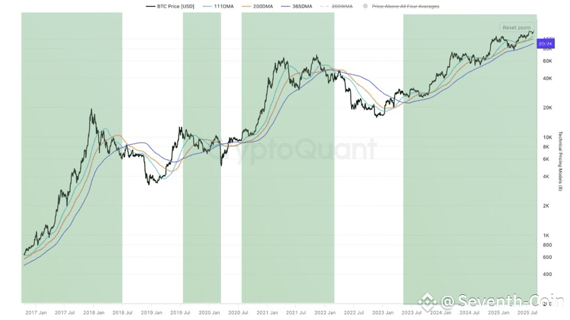 🔍 Seit 2017 stellen wir fest, dass Bitcoin Aufwärtsperioden verzeichnet, wenn die gleitenden Durchschnitte von 111 Tagen (blau) und 200 Tagen (orange) strikt über dem gleitenden Durchschnitt von 365 Tagen (lila) liegen.