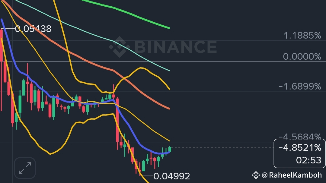 - **Durchbruch der wichtigen Unterstützung:** Der Preis hat gewaltsam die untere Bollinger-Band ($0.05057) und die wichtige psychologische Unterstützung bei $0.0500 **DURCHGESCHNITTEN**. Dies ist kein Test; es ist ein bestätigter Durchbruch.