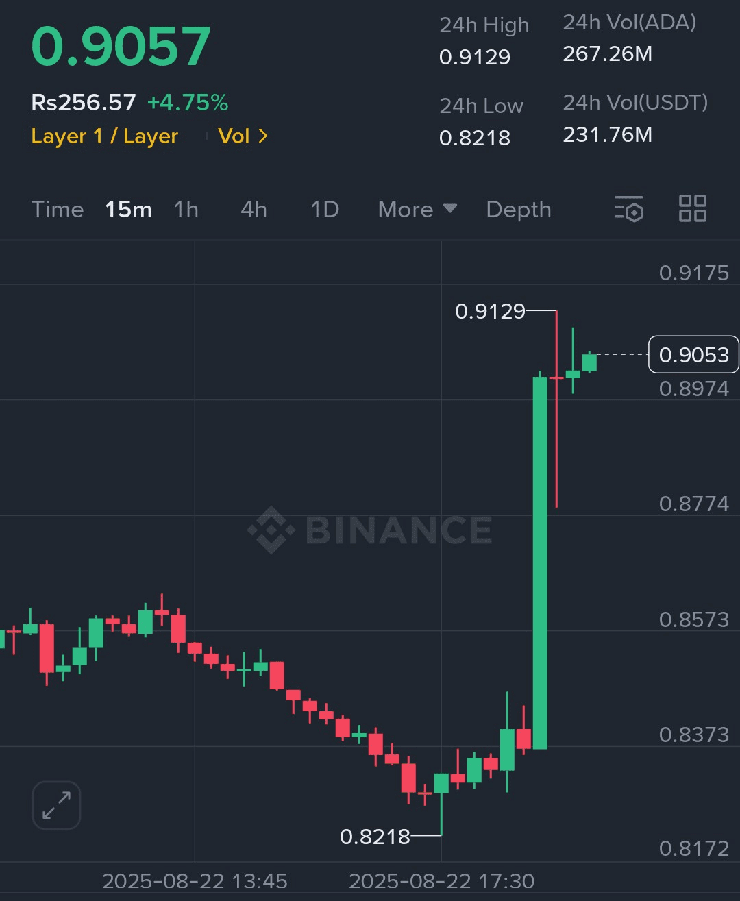 Cardano steigt mit frischem Kaufinteresse! Derzeit bei $0.9057 (+4.75%) im Handel, Momentum baut sich für eine potenzielle Fortsetzung nach oben auf.