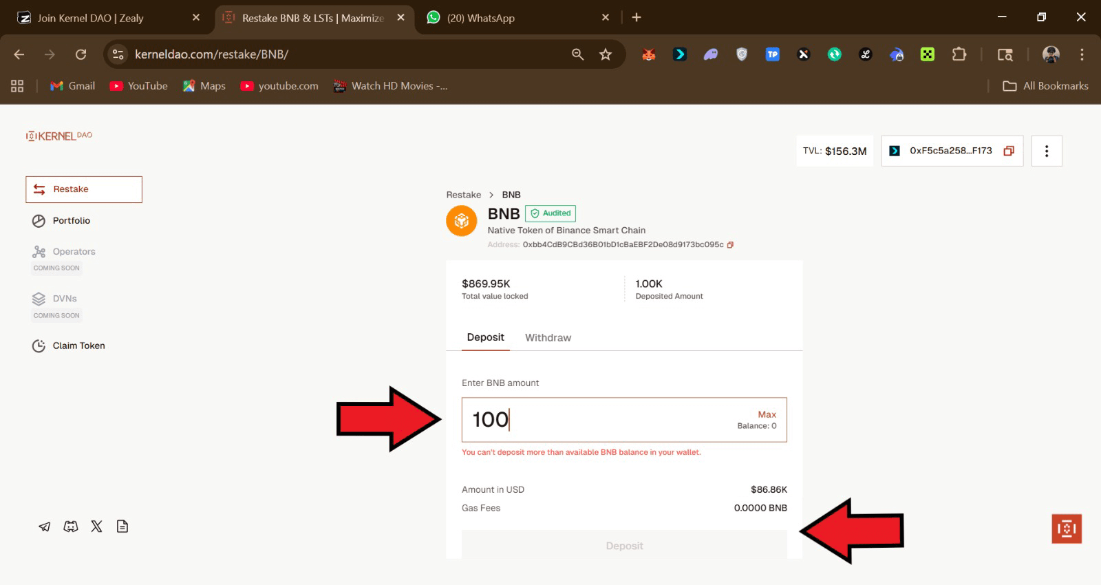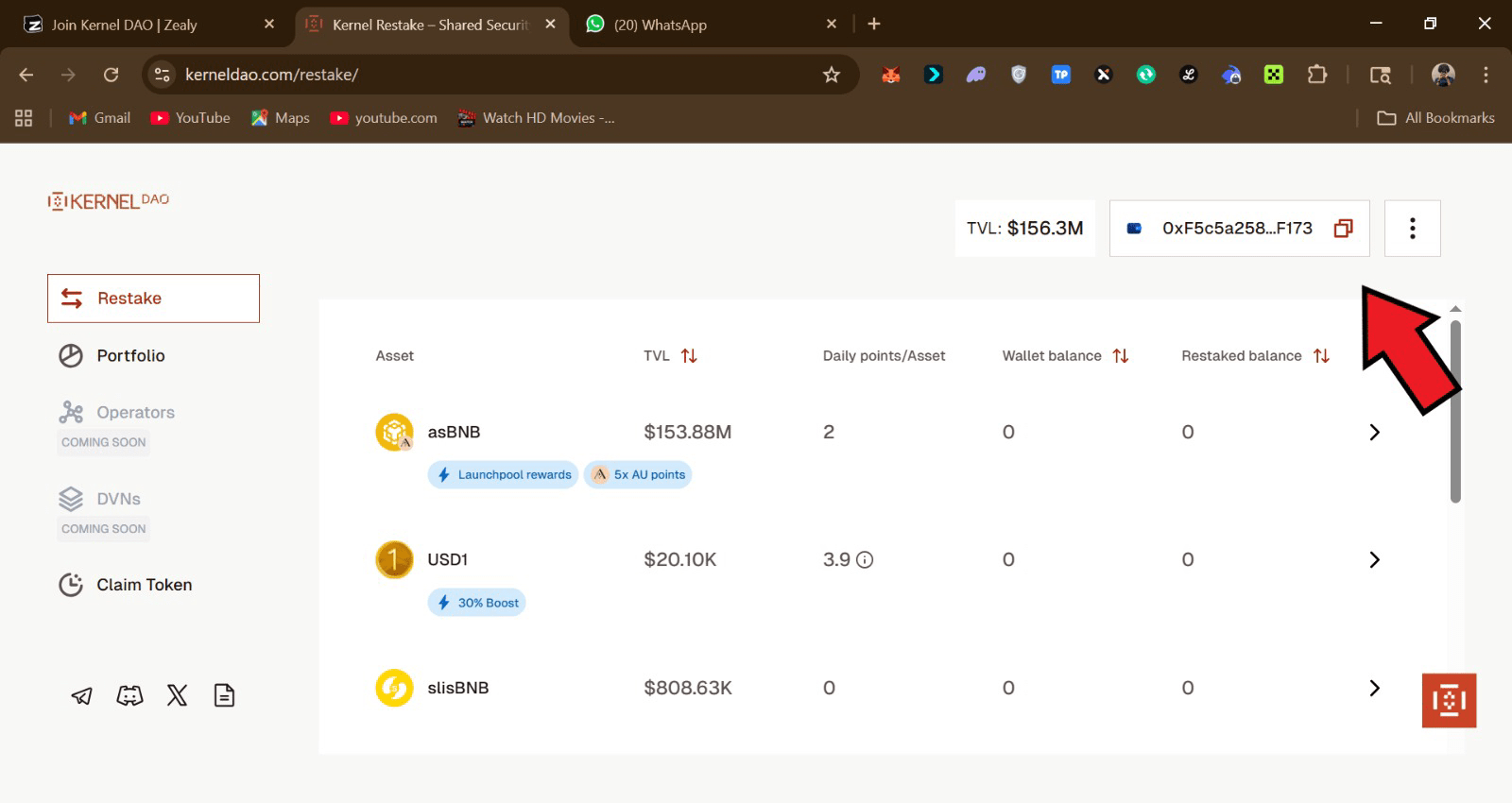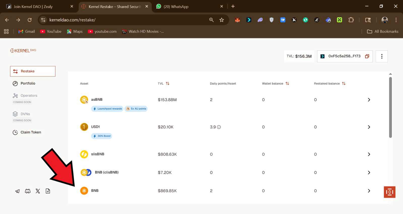 Gehen Sie zum Abschnitt Stake/Restake in der KernelDAO-App. Pools & APYs werden sichtbar sein.